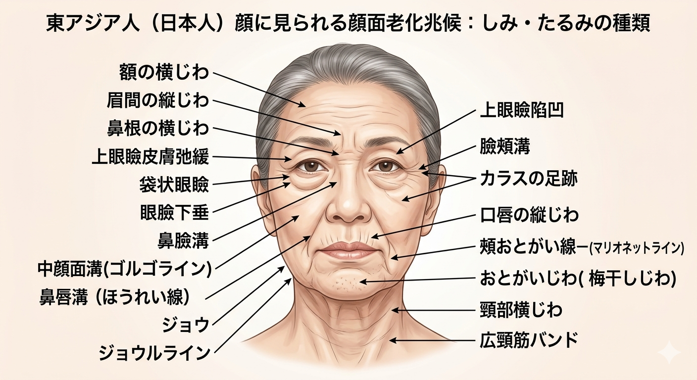 顔面は部位ごとに異なる老化パターンを示します。