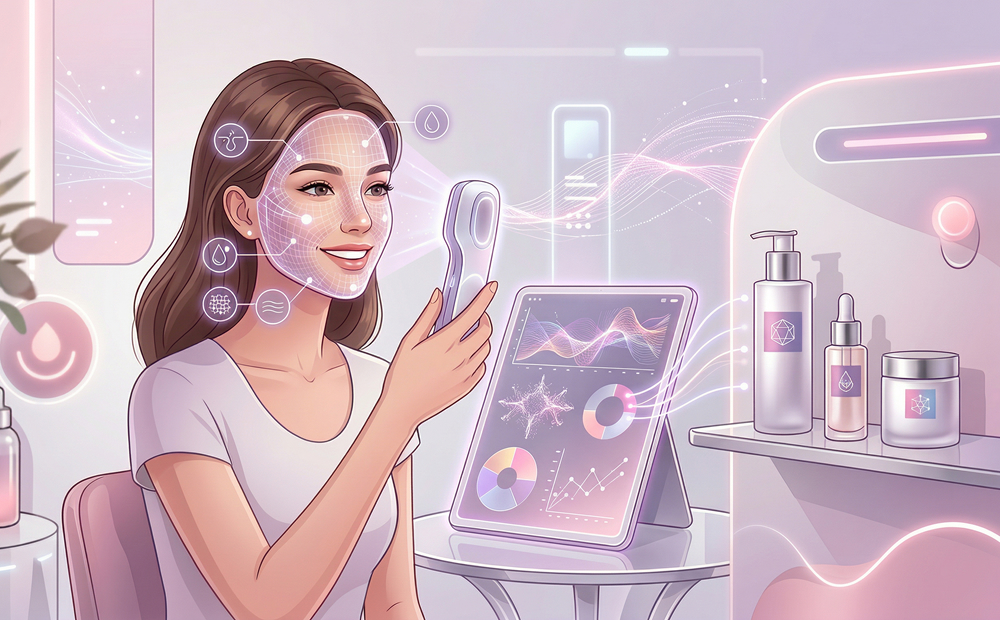 顔のデータは数万〜数十万のデータベースと照合され、シワの深さや色ムラ、毛穴、皮脂・水分量、ハリなどが総合的に評価されます。